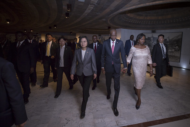 When the president's chartered aircraft came to a halt, ROC Ambassador to Haiti Hu Cheng-hao (胡正浩) and Chief of Protocol Yves Mazile of Haiti's National Palace boarded the plane to welcome her. After the president disembarked, accompanied by National Security Council Secretary-General David T. Lee (李大維) and Foreign Minister Joseph Wu (吳釗燮), she received flowers from Haitian schoolgirls. Haitian President Jovenel Moïse and his wife welcomed President Tsai at the foot of the airstair, and accompanied her as she received full military honors and reviewed the Haitian honor guard.