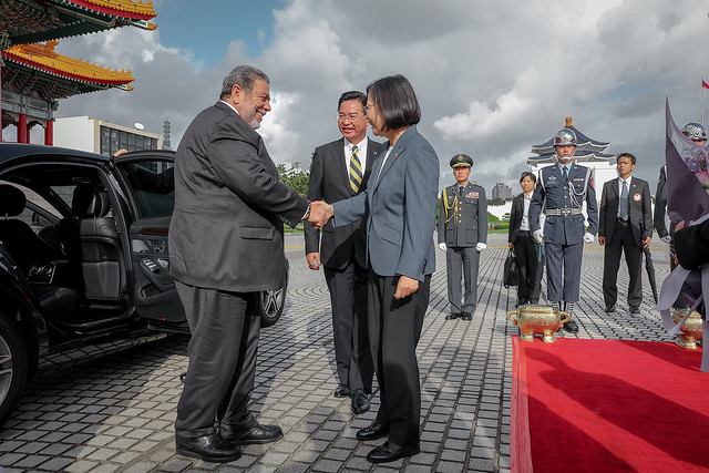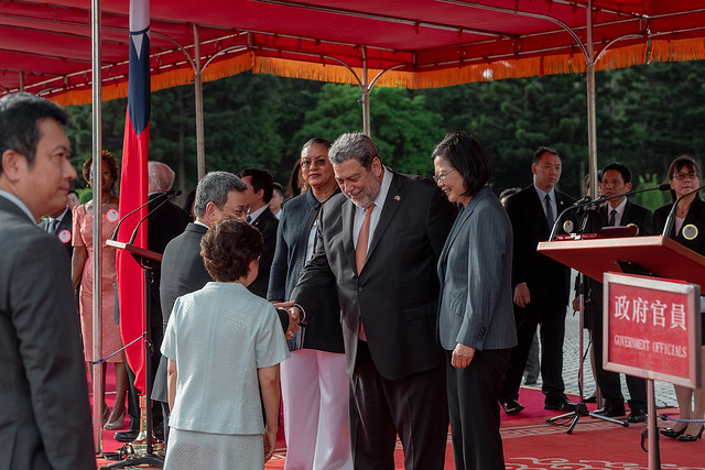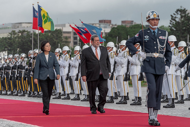 The welcome ceremony with military honors was held at 16:30 in the Main Plaza of the National Theater & Concert Hall of the National Performing Arts Center. After a 19-gun salute and the performance of the national anthems of both countries, President Tsai and Prime Minister Gonsalves each delivered an address.
