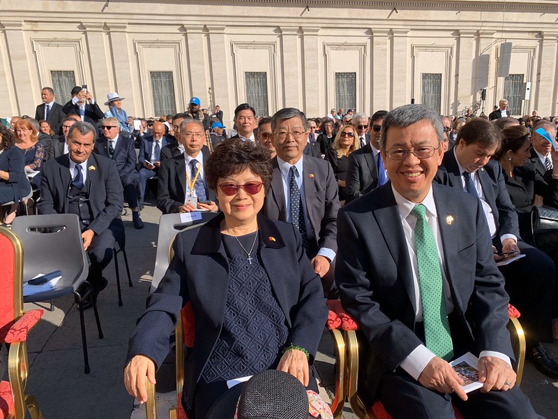 The Vatican protocol officer then escorted Vice President and Mrs. Chen to their seats in the square outside St. Peter's Basilica. Vice President Chen and Mrs. Chen were seated between Brazilian Vice President Hamilton Mourão and Ireland's Minister for Education and Skills Joe McHugh. Other national delegations were also present for the ceremony, including Italy (led by President Sergio Mattarella), the United Kingdom (led by HRH Prince Charles Philip Arthur George), India (led by Minister of State for External Affairs & Parliamentary Affairs Vellamvelly Muraleedharan), and Switzerland (led by Federal Councillor and Head of the Federal Department of Justice and Police Karin Keller-Sutter). Important cardinals, archbishops, and clergy members from various ministries in the Holy See also took part, and ambassadors and staff from many embassies to the Holy See also accepted invitations to attend. Over 10,000 people from around the world packed St. Peter's Square and the Via della Conciliazione to attend the canonization mass.