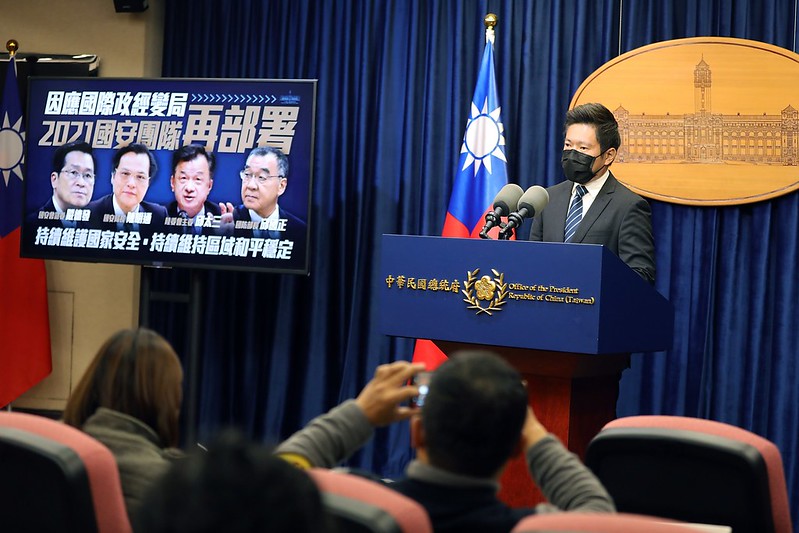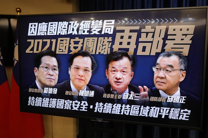Spokesperson Chang stated that the national security team will undergo a realignment in response to the changing regional and international political and economic landscape of the post-pandemic era. After considering the overall situation, soliciting advice, and holding discussions with Premier Su Tseng-chang (蘇貞昌), President Tsai Ing-wen has reorganized the team for the next stage of its mission, with Minister of National Defense Yen Teh-fa (嚴德發) to move to the National Security Council (NSC) as an advisor, and current National Security Bureau (NSB) Director-General Chiu Kuo-cheng (邱國正) to succeed him as the next national defense minister. Mainland Affairs Council (MAC) Minister Chen Ming-tong (陳明通) will assume leadership of the NSB, with former NSC Advisor Chiu Tai-san (邱太三) to succeed him at MAC.