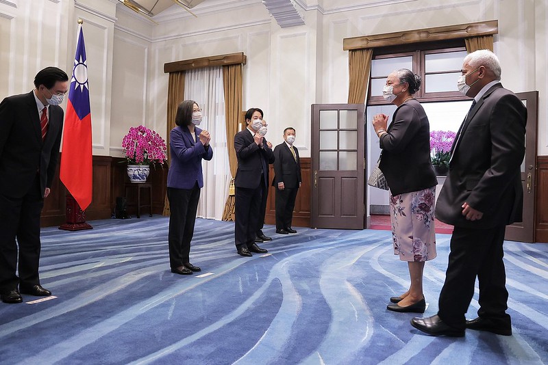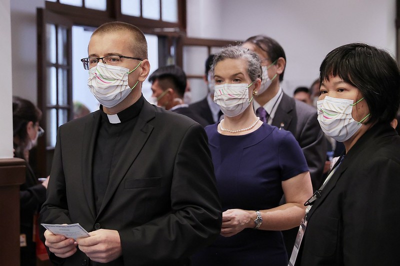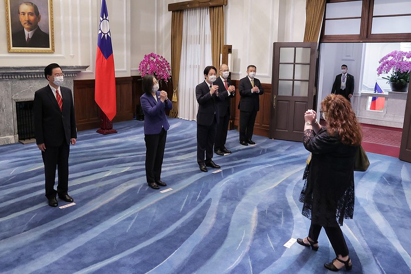 Foreign guests who attended the event to offer congratulations included 15 members of the foreign diplomatic corps stationed in Taiwan: St. Christopher and Nevis Ambassador Jasmine Elise Huggins (Dean of the foreign diplomatic corps in Taiwan), Palauan Ambassador Dilmei Louisa Olkeriil, Tuvalu Ambassador Limasene Teatu and her husband, Saint Lucia Ambassador Edwin Laurent, Guatemalan Ambassador Willy Alberto Gómez Tirado and Mrs. Gómez, Saint Vincent and the Grenadines Ambassador Andrea Clare Bowman, Nauruan Ambassador Jarden Kephas and Mrs. Kephas, Honduras Ambassador Eny Yamileth Bautista Guevara, Nicaraguan Ambassador Mirna Mariela Rivera Andino, Belize Ambassador Candice A. Pitts, Haiti Ambassador Roudy Stanley Penn, Paraguayan Chargé d'Affaires a.i. Carlos Vidal Pintos, Marshall Islands Chargé d'Affaires a.i. Anjanette Celles Anjel, Eswatini Chargé d'Affaires a.i. Lindiwe Cynthia Trizah Kunene, and First Secretary Monsignor Pavol Talapka of the Apostolic Nunciature; guests from foreign organizations stationed in Taiwan included: American Institute in Taiwan Taipei Office Director Sandra Oudkirk, Japan-Taiwan Exchange Association Taipei Office Chief Representative Hiroyasu Izumi and Mrs. Izumi, Head of the European Economic and Trade Office Filip Grzegorzewski, Singapore Trade Office in Taipei Trade Representative Yip Wei Kiat, Slovak Economic and Cultural Office in Taipei Representative Martin Podstavek and Mrs. Podstavek, Polish Office in Taipei Acting Head Bartosz Ryś and Mrs. Ryś, Czech Economic and Cultural Office Acting Representative Dita Taborska and her husband, Australian Representative Jenny Polyxeni Bloomfield, India-Taipei Association Director General Gourangalal Das and Mrs. Das, Korean Mission in Taipei Representative Young Hoon Kang and Mrs. Kang, New Zealand Commerce and Industry Office Acting Director Stephanie Lee, German Institute Taipei Director General Jörg Wolfram Polster and Mrs. Polster, British Office Taipei Acting Representative Tom Burn and Mrs. Burn, French Office in Taipei Deputy Director Guillaume Delvallée and his partner, and Canadian Trade Office in Taipei Acting Executive Director Eelco Hendrik Jager and Mrs. Jager; and representatives of international organizations: World Vegetable Center Deputy Director General Yann-rong Lin (林彥蓉), and Food and Fertilizer Technology Center for the Asian and Pacific Region Director Su-San Chang (張淑賢) and her husband.