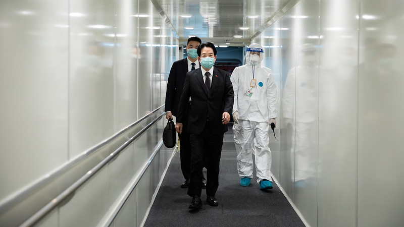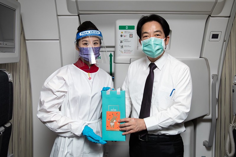 Following his remarks, Vice President Lai took a group photo with the China Airlines crew members. He then expressed his heartfelt thanks for their efforts to maintain a high level of safety, implementing strict disease prevention measures by wearing full personal protective equipment including isolation gowns and full-face shields throughout the flight.