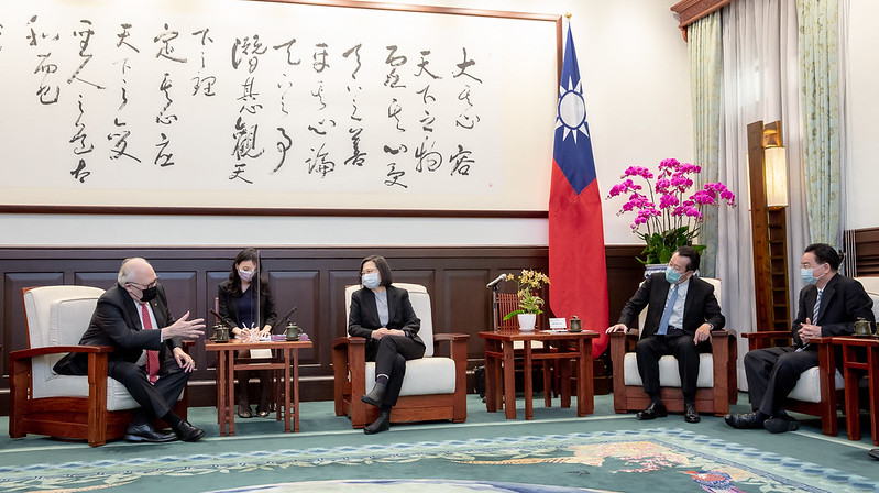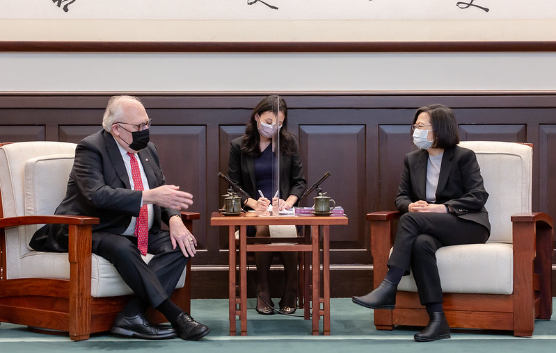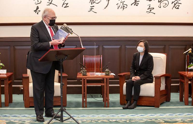 In 2019, we met twice at the Presidential Office. But because of the pandemic, it has been a while since your last visit. In addition to welcoming you and Mr. [Anthony] Kim, research fellow and editor of the Index of Economic Freedom, I would like to express my gratitude to you and the Heritage Foundation for your long-term support for stronger Taiwan-US relations. The Heritage Foundation works to promote democracy and free markets, values that are central to Taiwan's development.