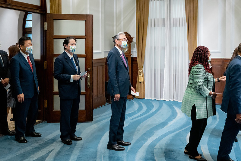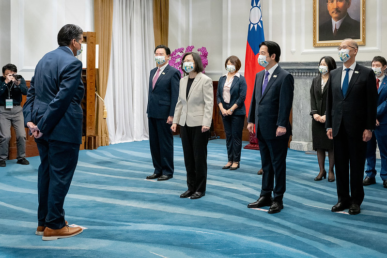 Dean of the Diplomatic Corps and Saint Vincent and the Grenadines Ambassador Andrea Clare Bowman and other members of the foreign diplomatic corps stationed in Taiwan also offered their congratulations, as did representatives of foreign organizations in Taiwan including American Institute in Taiwan Taipei Office Director Sandra Oudkirk and her husband, Japan-Taiwan Exchange Association Taipei Office Chief Representative Hiroyasu Izumi and his wife, Singapore Trade Office in Taipei Trade Representative Yip Wei Kiat, European Economic and Trade Office in Taiwan Acting Head Guillermo Martínez, Australian Representative to Taiwan Jenny Bloomfield, French Office in Taipei Director Jean-François Casabonne-Masonnave, German Institute Taipei Director General Jörg Polster and his wife, and British Office Taipei Representative John Dennis, as well as representatives from international organizations.
