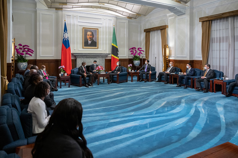 On the morning of November 8, after welcoming Prime Minister Terrance Drew of the Federation of St. Christopher and Nevis with military honors, President Tsai Ing-wen received the credentials of new St. Christopher and Nevis Ambassador Donya Francis, and, accompanied by Vice President Lai Ching-te, met with Prime Minister Drew for bilateral talks. In remarks at the meeting, President Tsai thanked St. Christopher and Nevis for its longstanding support for Taiwan's international participation, and said that the people of Taiwan were touched by Prime Minister Drew's speaking up for Taiwan at this year's United Nations General Assembly. The president also emphasized that Taiwan and St. Christopher and Nevis have stood together in facing the challenges of the pandemic, and said she looks forward to further deepening cooperation to revitalize our tourism sectors.