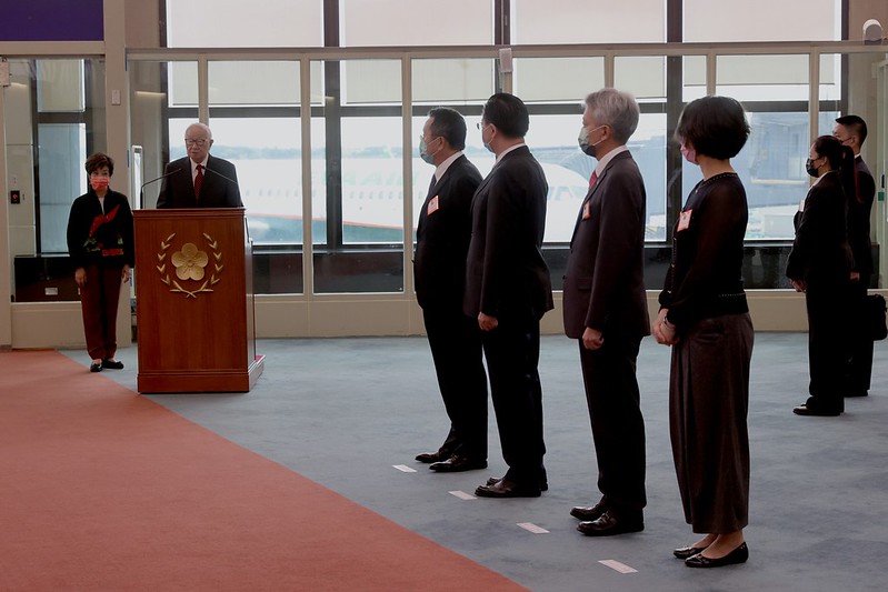In his remarks, Dr. Chang first thanked all those who had come to the airport to see him off, and noted that the upcoming AELM will be the first to convene in person in four years. He said that he and his wife, Mrs. Sophie Chang (張淑芬), are both very excited about the trip, and added that it marks the sixth time for him to accept a presidential appointment to attend APEC, the procedures of which he is now well familiar with.
