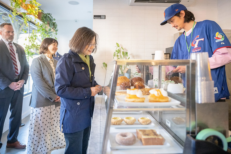 Afterward, President Tsai proceeded on foot to Win Son Bakery, where she listened to Josh Ku, a young Taiwanese-American and one of the bakery's founders, introduce the shop's specialties. The president personally ordered food there, sampling some Taiwanese-style food such as stuffed rice roll (fan tuan) and donut.