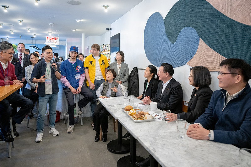 President Tsai held an in-person discussion with six groups of young Taiwanese-Americans in art, education, cuisine, and other fields, including Yun Hai founders Lin and Cheng Smith, Win Son Bakery founder Ku, bilingual actor Leo Yu-Ning Chang (張佑寧), Té Company tea store founder Elena Liao (廖梓君), CUNY Hunter College faculty member Dr. Ming-Ying Li (李明穎), and Yoseka Stationery store founders Neil Ni and Daisy Chen, during which the president listened to their experiences and stories of developing their careers and starting businesses in the US.