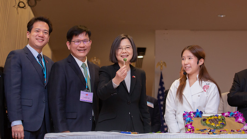 During the event, young chef Liya presented the president with a desert of sweet glass rice dumplings (the term in Mandarin being homophonous with "fortunate connections") arranged in the shape of Taiwan, along with a flower arrangement that spelled out "team Taiwan" (the phrase in Mandarin being homophonous with "support Taiwan").