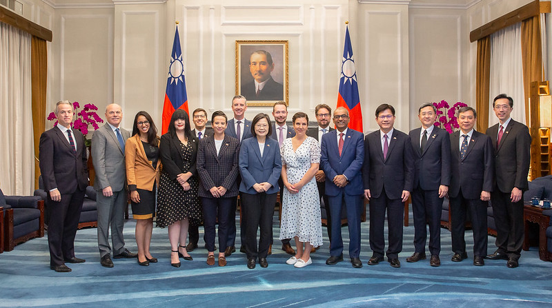 The delegation also included Members of Parliament Kyle Seeback, Marilene Gill, Marie-Helene Gaudreau, Chandra Arya, Michael Barrett, and Garnett Genuis and his wife Mrs. Rebecca Genuis. The delegation was accompanied to the Presidential Office by Canadian Trade Office in Taipei Executive Director Jim Nickel.