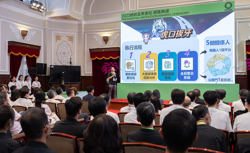 On the afternoon of September 24, President Tsai Ing-wen attended the 2023 Presidential Hackathon awards ceremony, praising the award-winning teams for showing the problem-solving hackathon spirit and creating proposals for Taiwan that are both innovative and feasible. The aim of the Presidential Hackathon, she said, is to establish close cooperation between members from different government agencies with different areas of expertise and private sector experts from various fields, and to help these groups learn from one another. Efforts over the past few years have not only increased the share of public sector participation and proposals each year, she said, but have also led to the implementation of numerous award-winning projects in government agencies, increasing efficiency. She also expressed hope that proposals from outstanding teams can be promoted in all counties and cities in Taiwan so that the Presidential Hackathon's achievements can take root nationwide.