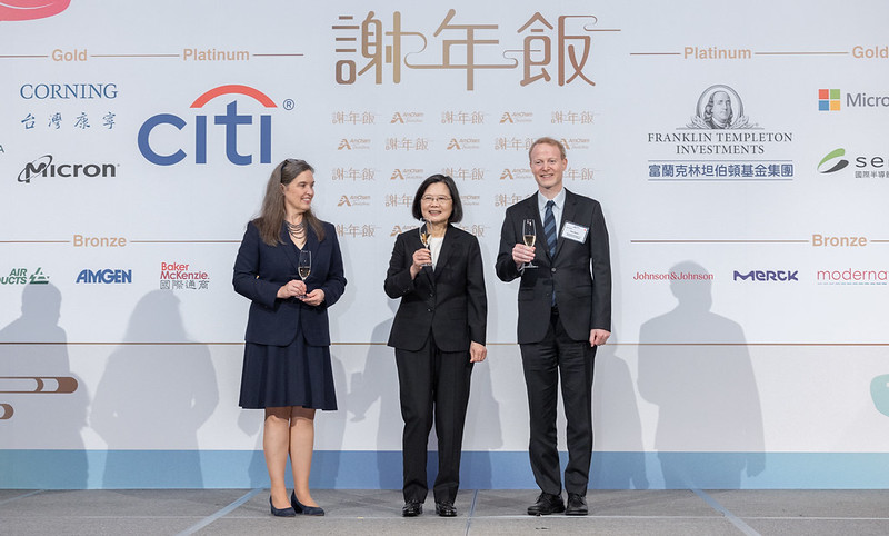 After remarks, President Tsai, AmCham Chairperson Silver, and American Institute in Taiwan Taipei Office Director Sandra Oudkirk raised their glasses in recognition of the strong Taiwan-US friendship.