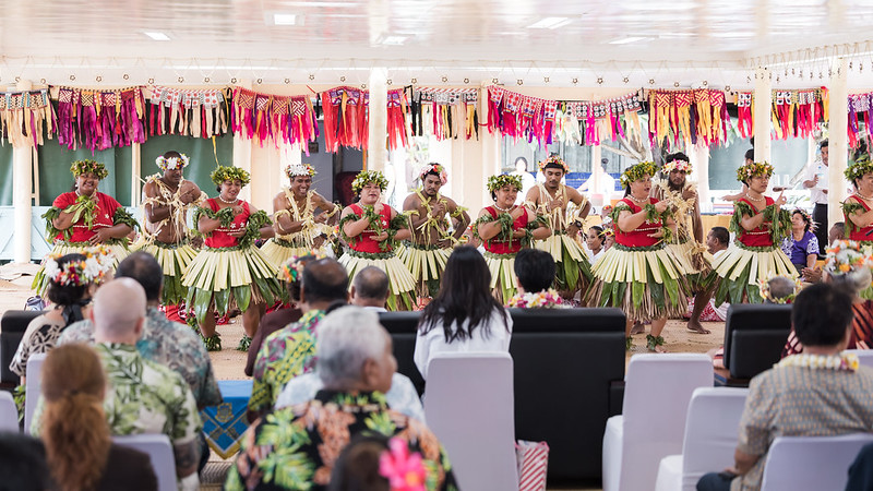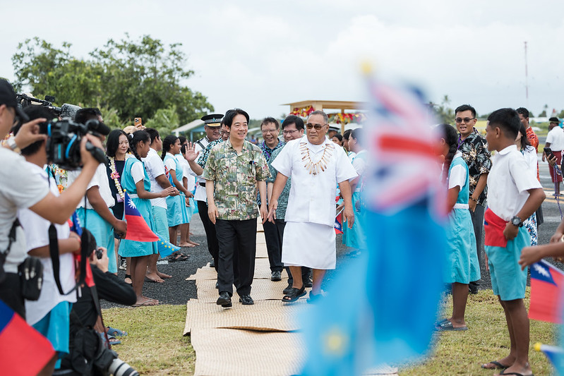 President Lai was welcomed to Tuvalu on the plane by Ambassador to Tuvalu Lin Tung-heng (林東亨) and Tuvaluan protocol officer Oilau Paeniu, and after alighting from the plane was greeted by Minister of Foreign Affairs, Labour and Trade Paulson Panapa and Police Commissioner Piliota Viliamu, who accompanied the president along a traditional coconut-frond mat to a dais, where he was personally welcomed by Governor-General Tofiga Vaevalu Falani. Together, they reviewed a police honor guard from the dais, and after a salute, proceeded into a pavilion, where the president was greeted at the entrance by Prime Minister Feleti Penitala Teo and presented with a floral garland. The president was then warmly welcomed with a performance of Tuvaluan traditional dance, following which he sprinkled perfumed water on the performers, an act of affirmation and praise in Tuvaluan culture.