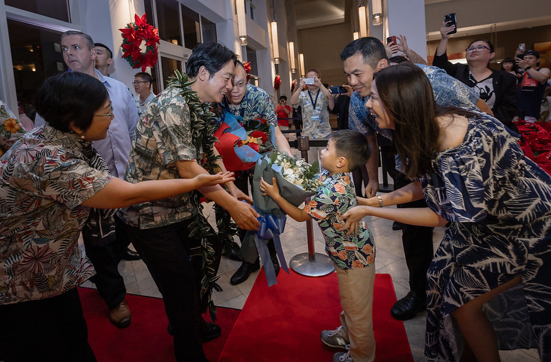 President Lai was welcomed to Guam on the plane by Representative to the United States Alexander Tah-ray Yui (俞大㵢) and American Institute in Taiwan Managing Director Ingrid Larson, and after alighting from the plane was greeted by Governor of Guam Lourdes A. Leon Guerrero and her husband Jeffrey A. Cook, Chief of Staff Jon Calvo, and Chief of Protocol Joseph Shinohara with a lei. The president and his delegation then traveled by car to their hotel, where they were warmly greeted by members of our overseas community. President Lai shook hands with our fellow Taiwanese in attendance amidst a lively and joyful atmosphere.