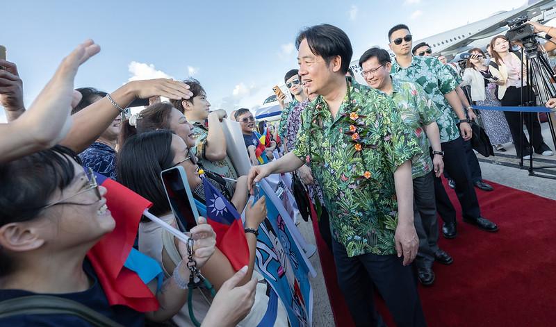 President Lai was welcomed to the Republic of Palau on the plane by Ambassador to Palau Jessica C. Lee (黎倩儀) and Palauan Minister of State Gustav Aitaro. In the ensuing welcome ceremony, initiated by a young Palauan blowing on a conch shell, President Lai waved to the welcoming crowd as Secretary-General to the President Pan Men-an (潘孟安) and Minister of Foreign Affairs Lin Chia-lung (林佳龍) accompanied him off the aircraft, where he accepted a lei from a Palauan representative.