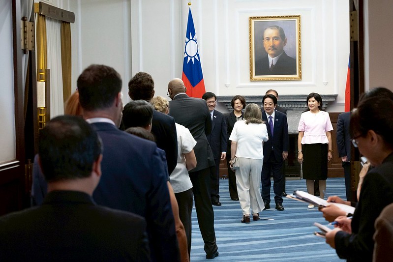 On the morning of October 10 at the Presidential Office Building, President Lai Ching-te and the First Lady, accompanied by Vice President Bi-khim Hsiao, received congratulations from members of the foreign diplomatic corps and foreign organizations stationed in Taiwan, as well as guests from around the world attending the 2025 National Day Celebration of the Republic of China.