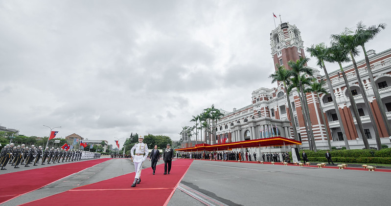 The welcome ceremony began at 10:30 a.m. in the plaza fronting the Presidential Office. President Lai and Prime Minister Teo each delivered remarks after a 19-gun salute, the playing of the two countries’ national anthems, and a review of the military honor guard.
