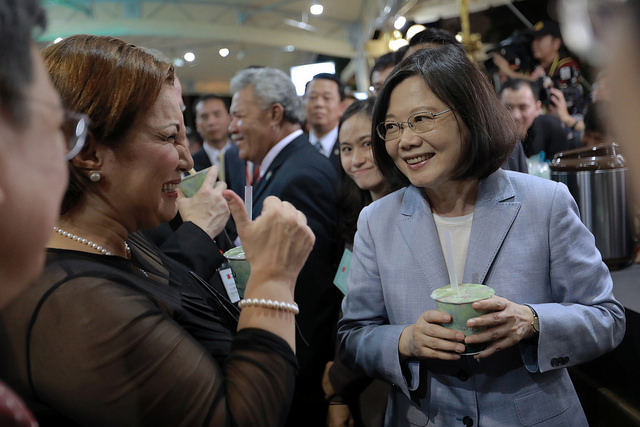 The reception featured traditional cuisine from all parts of Taiwan, as well as Asian, Western, halal, and vegetarian dishes. Vice President Chen led Prime Minister Sopoaga and his wife to booths serving kaoliang liquor from Kinmen and Matsu, as well as others representing Din Tai Fung and Wu-Mu noodles. In addition to receiving an introduction to Taiwanese delicacies, the guests also tried some Kinmen kaoliang, Matsu kaoliang, steamed dumplings, gua bao (a Taiwan-style hamburger), and Matsu old wine noodles. When the president arrived later she also joined the reception, and after trying some bubble tea gave a thumbs-up to express approval.