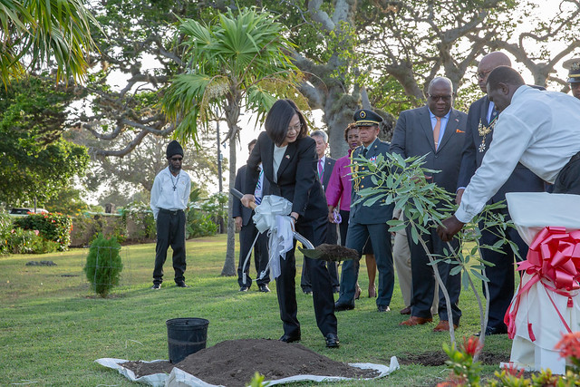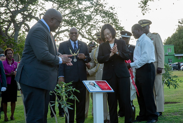 President Tsai was personally welcomed upon arrival at the Government House of St. Kitts & Nevis by Governor-General Tapley Seaton, followed by an honor guard salute. After a performance of the two countries' national anthems, Governor-General Seaton accompanied President Tsai to participate in a tree planting ceremony. They planted a Golden Trumpet tree and unveiled a memorial tablet as testimony to the steadfast friendship and enduring alliance between Taiwan and St. Christopher and Nevis.