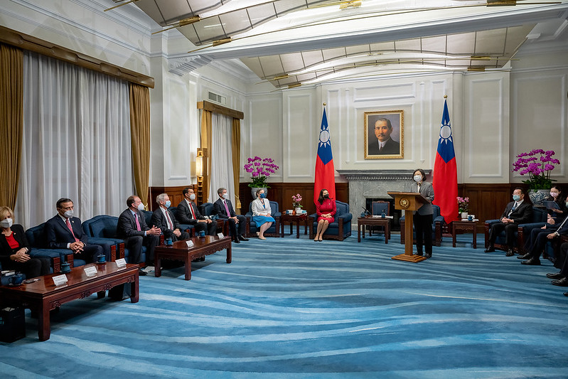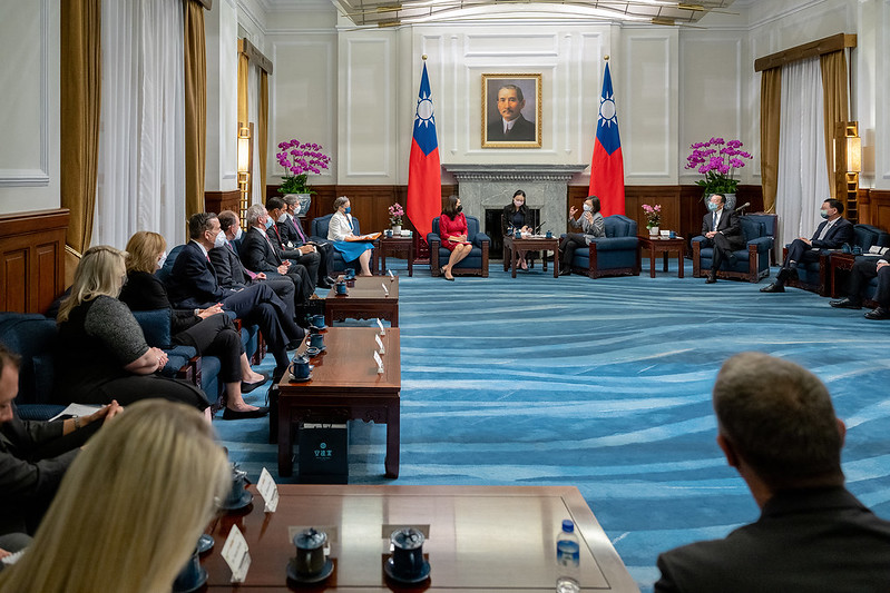 The delegation also included Members of the US House of Representatives Kai Kahele, Joe Wilson, Andy Barr, Darrell Issa, Claudia Tenney, and Kat Cammack. They were accompanied to the Presidential Office by American Institute in Taiwan Taipei Office Director Sandra Oudkirk.