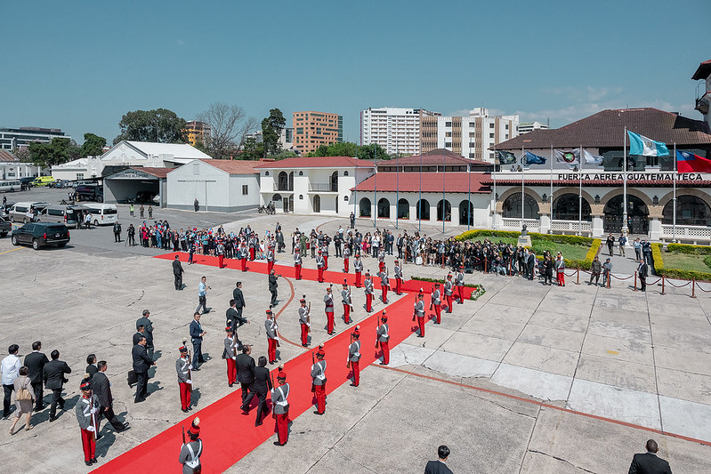 President Tsai's delegation was welcomed to Guatemala on the plane by Ambassador to Guatemala Miguel Li-Jey Tsao (曹立傑) and Guatemalan General Director of Protocol and Diplomatic Ceremonies David Vargas, and after alighting from the plane was received with military honors by Guatemalan Foreign Minister Mario Búcaro.